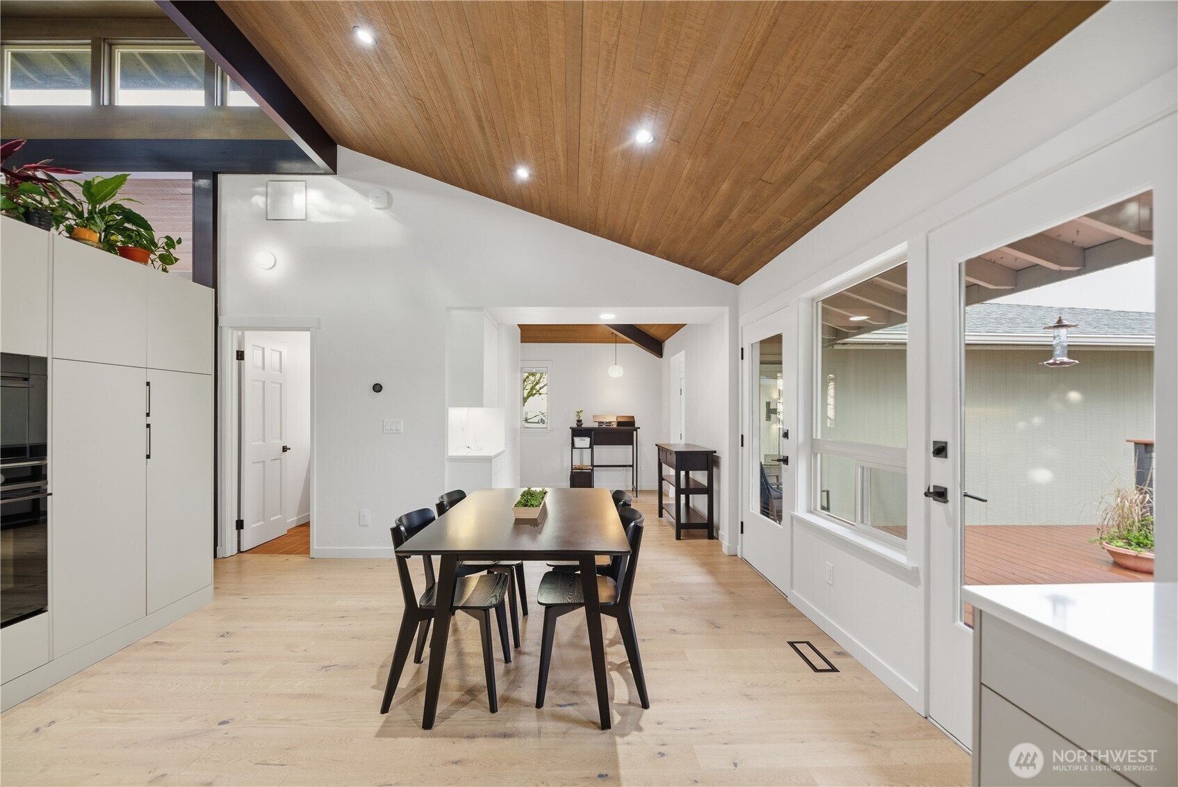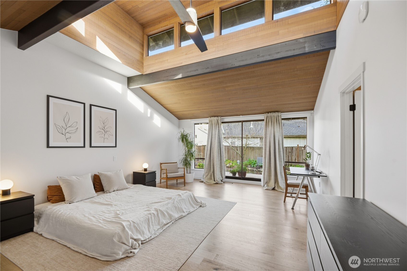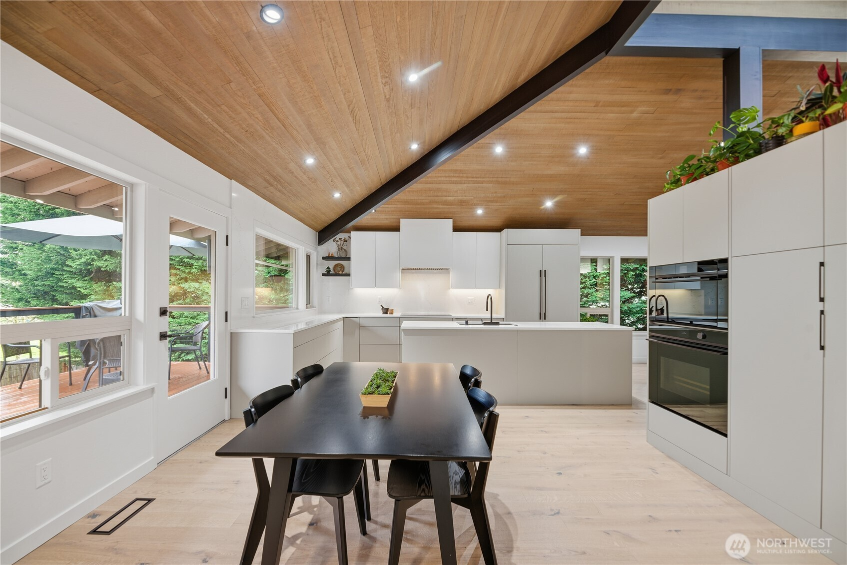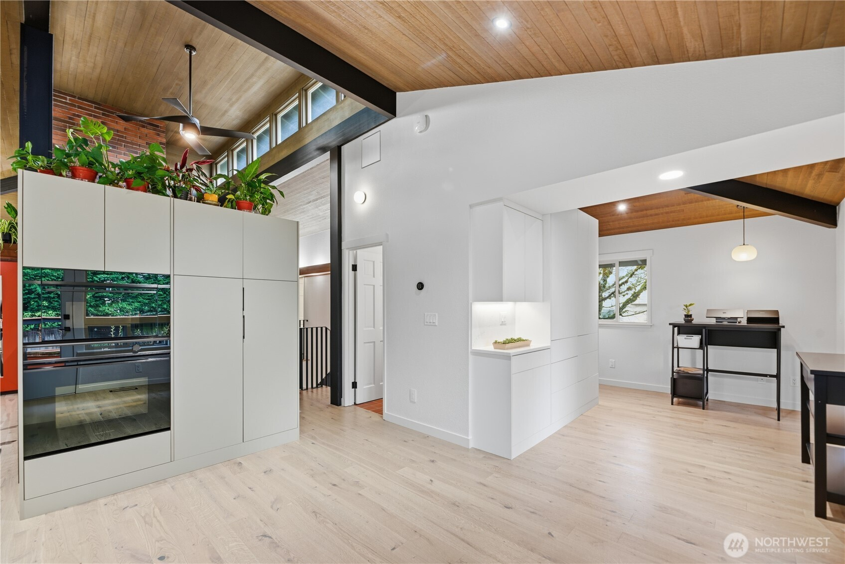 Exceptional quality throughout, from kiln-dried framing to powder-coated railings. Fisher & Paykel induction cooktop, oven, speed oven, dual-drawer dishwasher, large pantries & tech closet in kitchen. Clerestory windows & cedar ceiling frame a dramatic two-story floor-to-ceiling fireplace. Main-level primary suite offers a sunken tub/shower, sauna & private deck. Two additional main-level ensuite bedrooms. Lower level features two bedrooms, full bath, 2nd family room/library, flex space, soundproof office, laundry & storage. 2-car garage with loft storage + ample off-street parking. New heat pumps & water filtration. Walk to parks, schools, trail, library & market.
